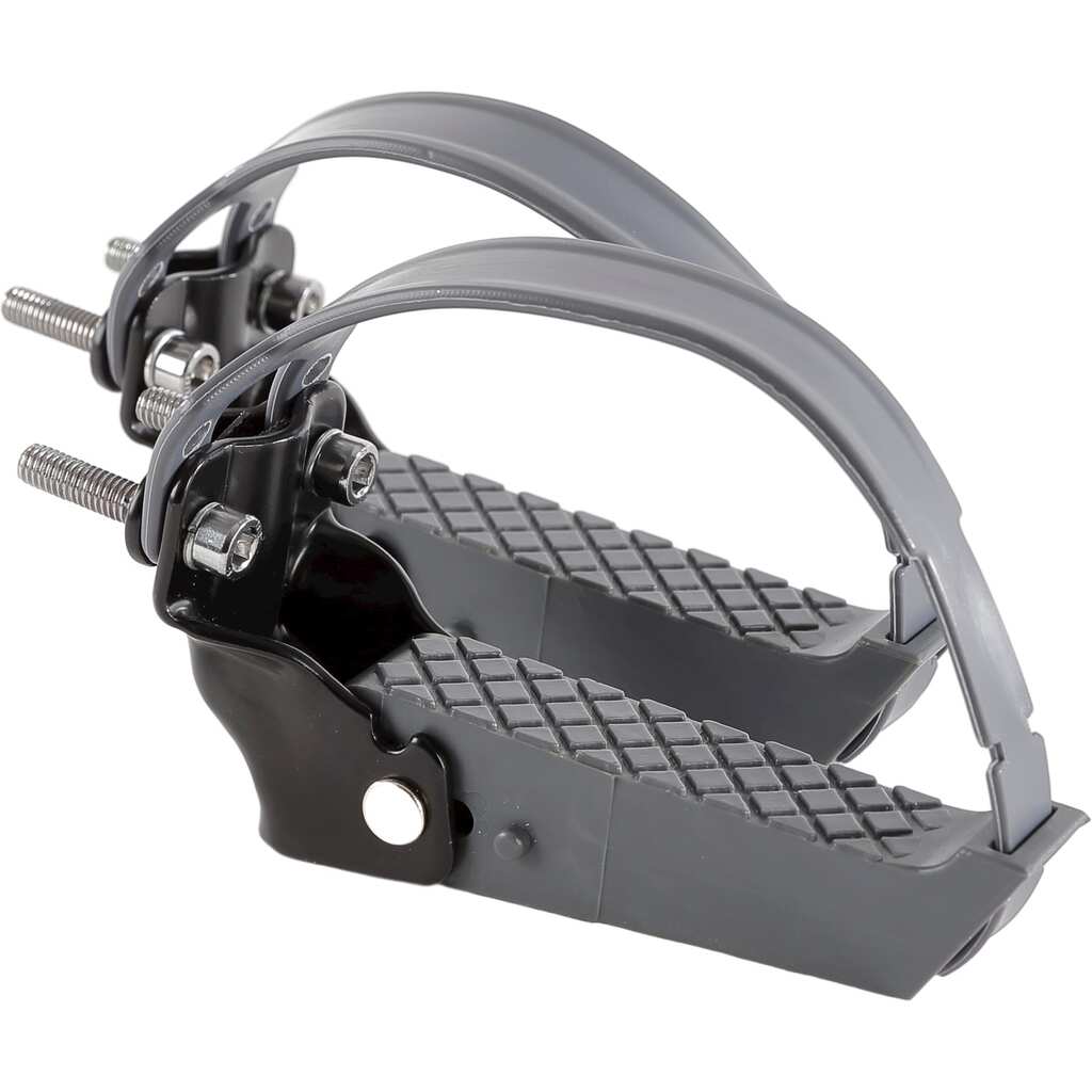 Mirage opklapbare voetsteunen voor bevestiging aan de achtervork, voorzien van veiligheidsriemen, borgpin om de voetsteunen opklapbaar te hoeden, antislip op de voeststeun, RVS bouten, inbussleutel